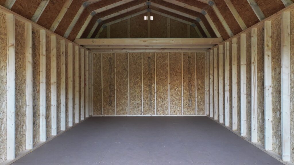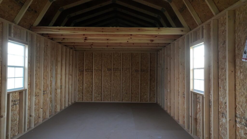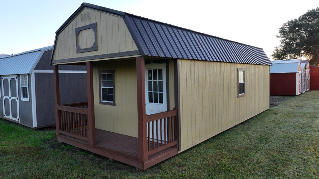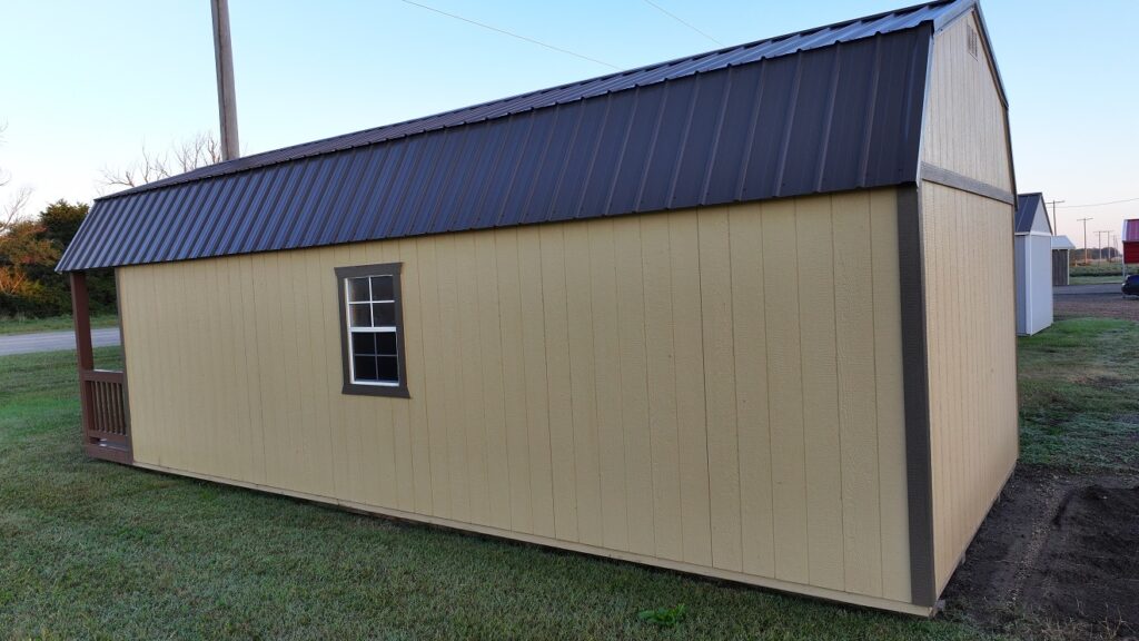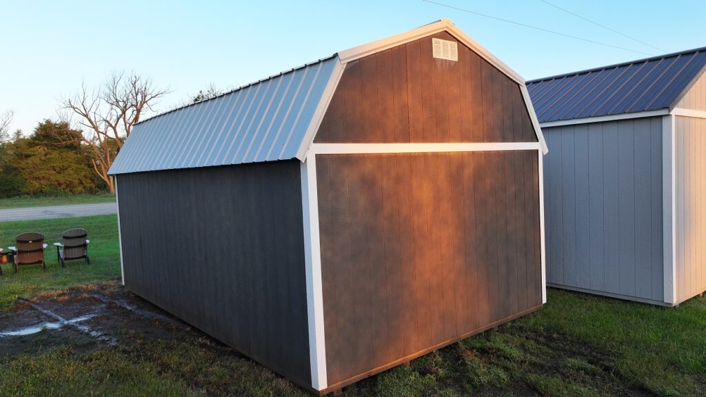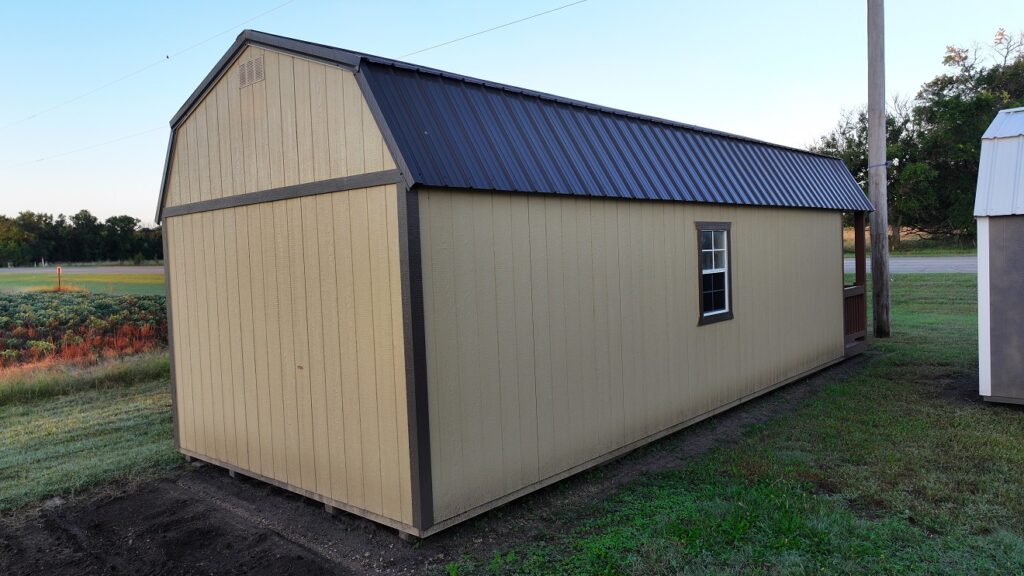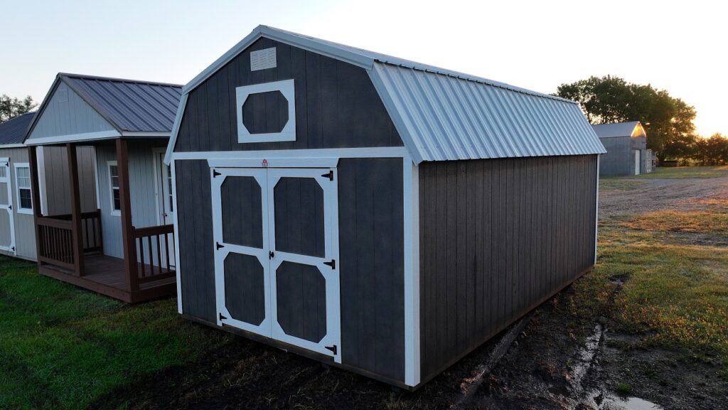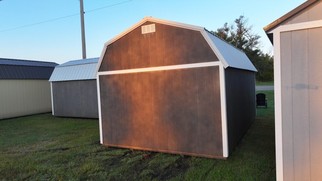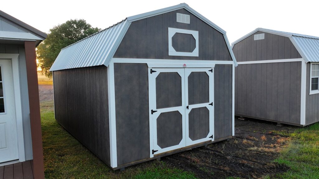 12’x20′ Lofted Barn: $7,168 on 5% Sale. Orig: $7,565 —3yr: $333/mo. -4yr: $299/mo. -5yr: $266/mo. —A beautiful building to place and use! Shown with Driftwood urethane sides, Alamo White metal roof and White trim. Plenty of room for mowers, projects, camping gear…! What is the biggest pressing need? Sizes up to 16’x50′! Made with price by our talented craftsmen! Where would this building look best? —RTO down payment is 1 month’s payment