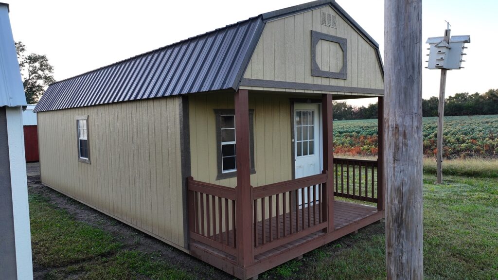 16’x32′ Side Cabin with Transom Dormer, Insulation, Elec… $22,123 on 20% Lot Sale. Orig: $27,654. —3yr: $1,024/mo. -4yr: $922/mo. -5yr: $819/mo. —An awesome deal on a very versatile and useable Cabin! Shown in Mushroom sides, Black metal roof and Black trim. Perfect for a “Tiny House,” hunting cabin, guesthouse, office/store…. Options include thermal pane windows, spray-foam walls and roof and electric. Sizes available up to 16’x50′ with and without porch, dormers etc. Many colors to choose from! Made by our talented craftsmen! Would this building be the perfect fit for that spot/need? —RTO down payment is 1 month’s payment plus $750 security deposit.