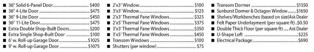 —On Lot Building List: —12’x24′ Cabin with Lap Siding and Thermal Pane Windows: $11,948. Orig: $13,275. —12’x20′ Cabana: 10% Sale: $7,286. Orig: $13,275. —8’x20′ Chicken Coop: 10% Sale $6,903. Orig: $7,670. —10’x16′ Cottage Shed: 10% Sale: $4,684. Orig: $5,205 —8’x16′ Dog Kennel with Heavy Duty black Panels:10% Sale: $6,098. Orig: $6,775. —14’x30′ Garage with Double Floor: 15% Sale: $12,253. Orig: $14,415. —10’x20′ Greenhouse with Solar Exhaust Fan: 10% Sale: $6,925. Orig: $7,695. —10’x16′ Lofted Barn with Double Metal Frame Door: 10% Sale: $5,526. Orig: $6,140. —12’x20′ Lofted Barn: 10% Sale: $6,804. Orig: $7,565.—8’x12′ Lofted Barn: 10% Sale: $2,741. Orig: $3,045. —12’x24′ Lofted Barn Cabin with Extra-Height Walls: 10% Sale: $9,855. Orig: $10,950. —6’x8′ Metro Shed: 10% Sale: $2,084. —10’x16′ Metro Garden Shed with Insulation and Board/Batten Siding: 10% Sale: $5,697. Orig: $6,330. —10’x16′ Platinum (Painted) Cabana: 10% Sale: $5,306. Orig: $5,895. —10’x12′ Playhouse Hideout: 10% Sale: $3,852. Orig: $4,280. —16’x32′ Side Cabin with Transom Dormers, Insulation and Electric: 20% Sale: $22,120. Orig: $27,654. —Side Gable Utility with ramp-style door: 10% Sale: $7,691. Orig: $8,545. —12’x20′ Side Lofted Barn with Pop-Up Dormer and U-Shaped loft: 10% Sale: $8,406. Orig: $9,340. —12’x24′ Lofted Barn Garage “Handyman” with electric, workbench, pegboard and rubberized floor: 10% Sale: $12,201. Orig: $13,557. —12’x20′ Z-Metal Side Lofted Utility with U-Shaped Loft: 10% Sale: $7,371. Orig: $8,190. —12’x16′ Side Utility with Transom Windows: 10% Sale: $5,531. Orig: $6,145. —10’x12′ Standard Barn: 10% Sale: $3,330. Orig: $3,700. —10’x12′ Horizontal Metal Utility: 10% Sale: $3,123. Orig: $3,470. —8’x12′ Utility: 10% Sale: $2,826. Orig: $3,140.